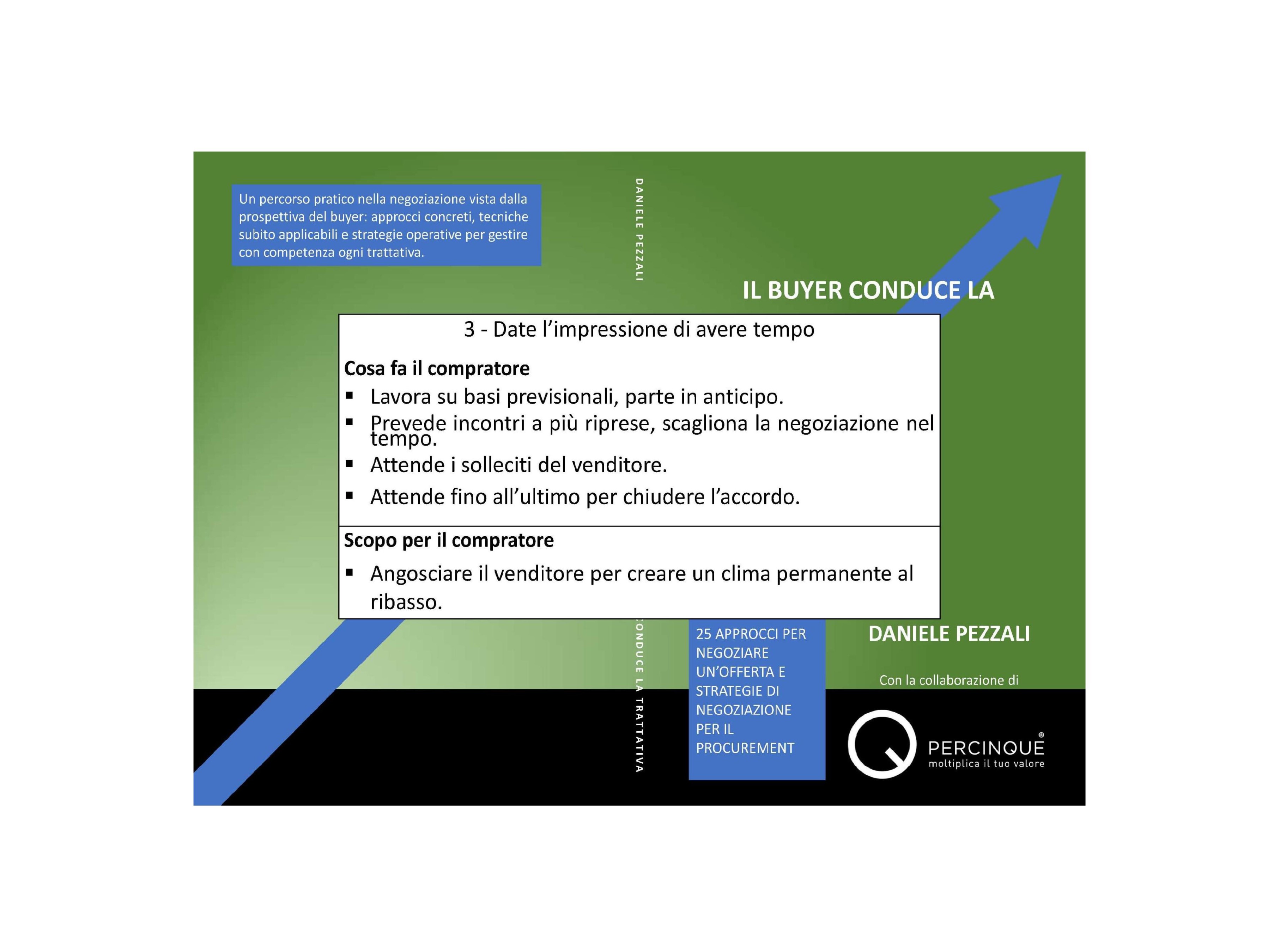 Dare l’impressione di avere tempo è una strategia sottile ma estremamente potente, perché rovescia l’asse emotivo della trattativa: non è il buyer a inseguire il venditore, ma è il venditore a percepire la necessità di accelerare, di non perdere l’opportunità, di essere lui a proporre concessioni pur di chiudere l’accordo. Il compratore che lavora con largo anticipo sui fabbisogni, che pianifica sulla base delle previsioni e che avvia il processo negoziale in tempo utile non ha mai l’urgenza come compagna di viaggio.
